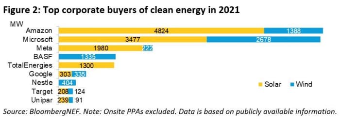 bought a record 31.1 gigawatts of renewable energy to run their operations in 2021. That’s a jump of nearly 24% from the previous year’s record of 25.1GW of renewables, mostly solar and wind.